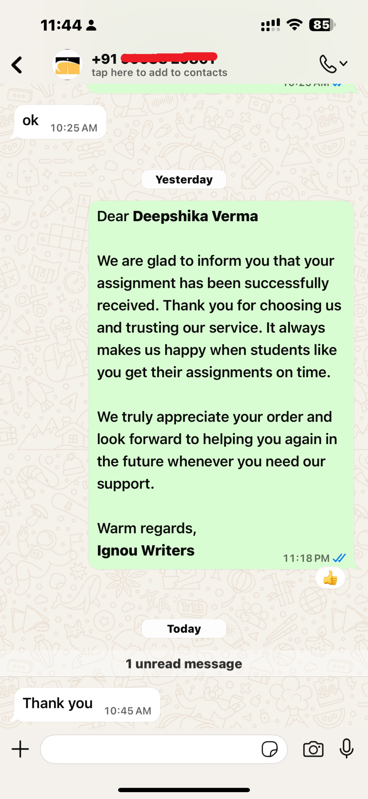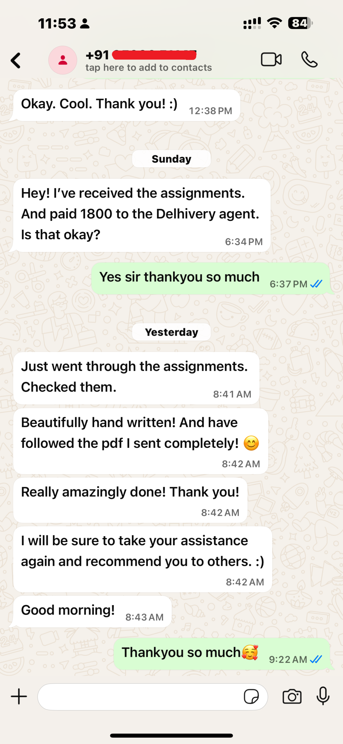 Genuine WhatsApp chats from students who received neat handwritten assignments with on-time delivery.